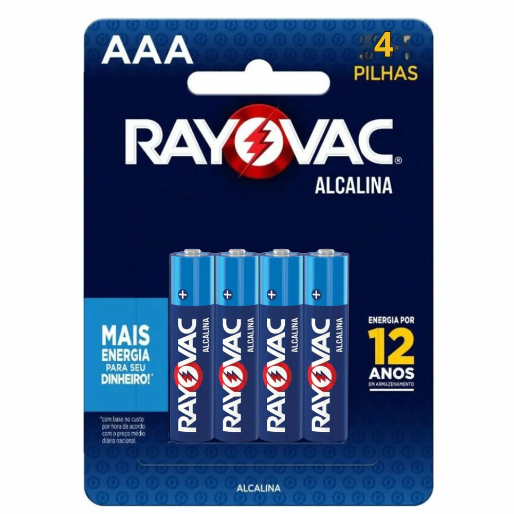 Conteúdo na embalagem:  1 pacote com quatro pilhas alcalinas 3A Rayovac